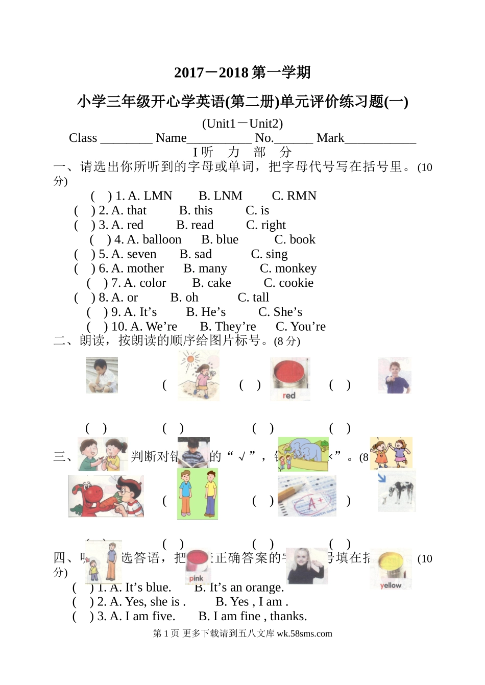2017-2018第一学期小学三年级开心学英语(第二册)单元评价练习题(一)(Unit1-Unit2)Class________Name__________No.______Mark___________I听力部分一、请选出你所听到的字母或单词,把字母代号写在括号里。(10分...