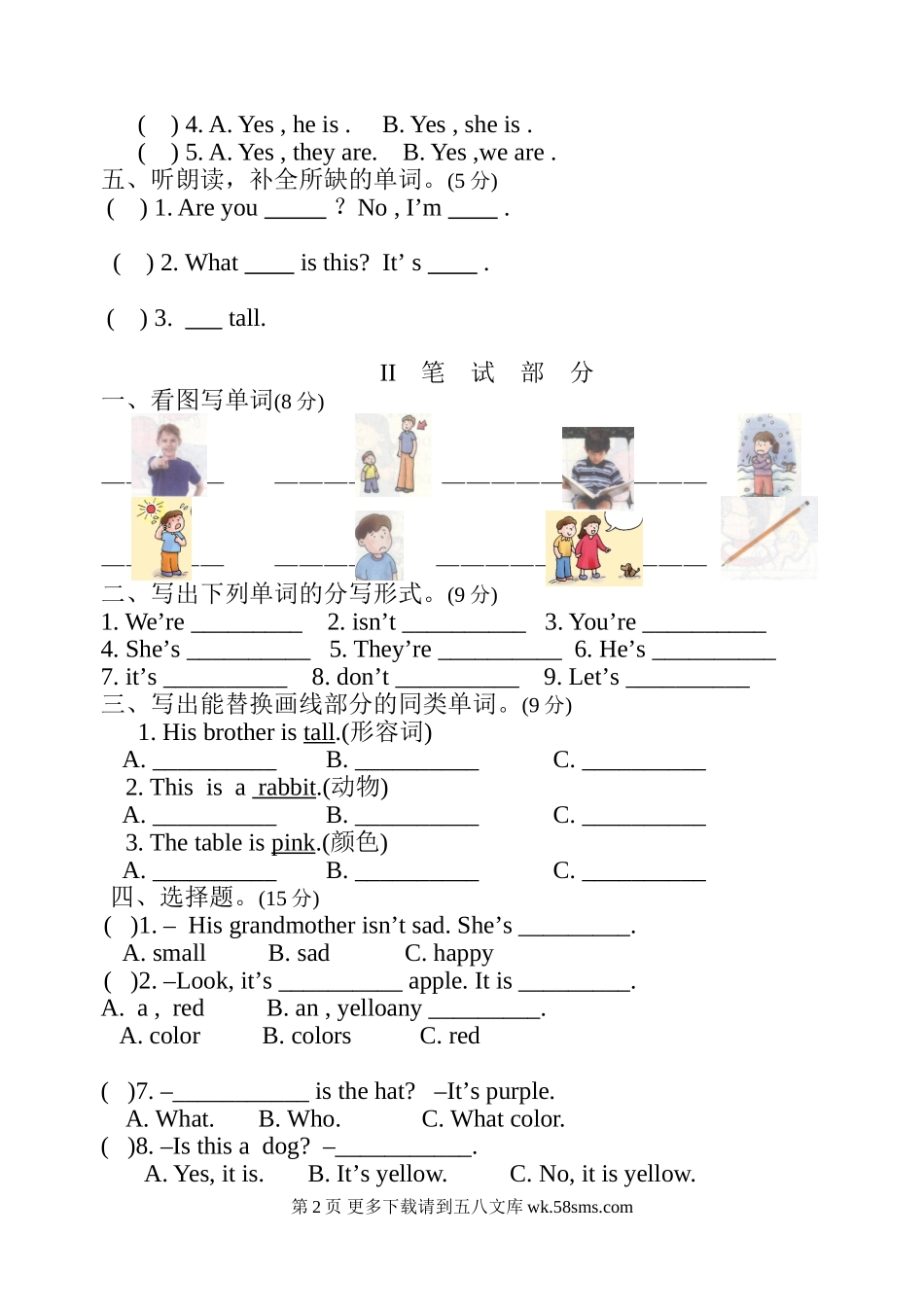2018年开心英语三年级下册Unit 1 — Unit 2单元测试题及答案.doc_第2页