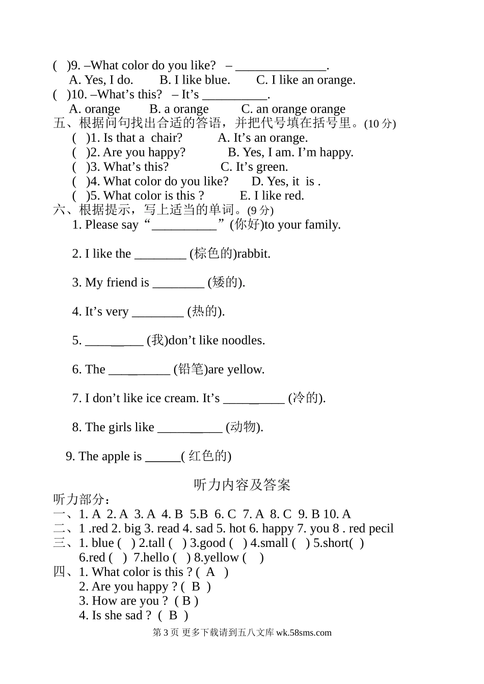 2018年开心英语三年级下册Unit 1 — Unit 2单元测试题及答案.doc_第3页