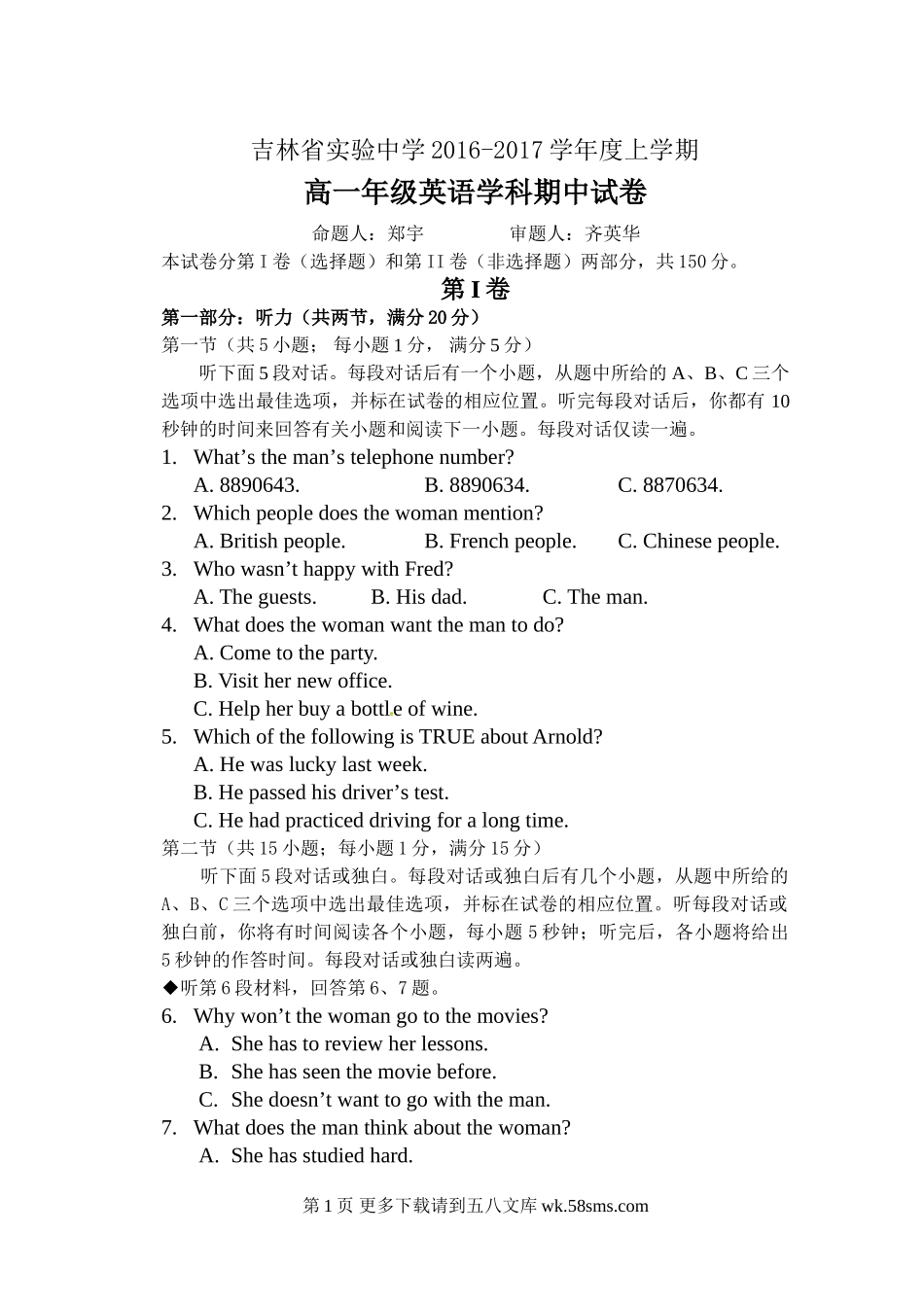 吉林省实验中学2016-2017学年度上学期高一年级英语学科期中试卷命题人:郑宇审题人:齐英华本试卷分第I卷(选择题)和第II卷(非选择题)两部分,共150分。第I卷第一部分:听力(共两节,满分20分)第一节(共5小...