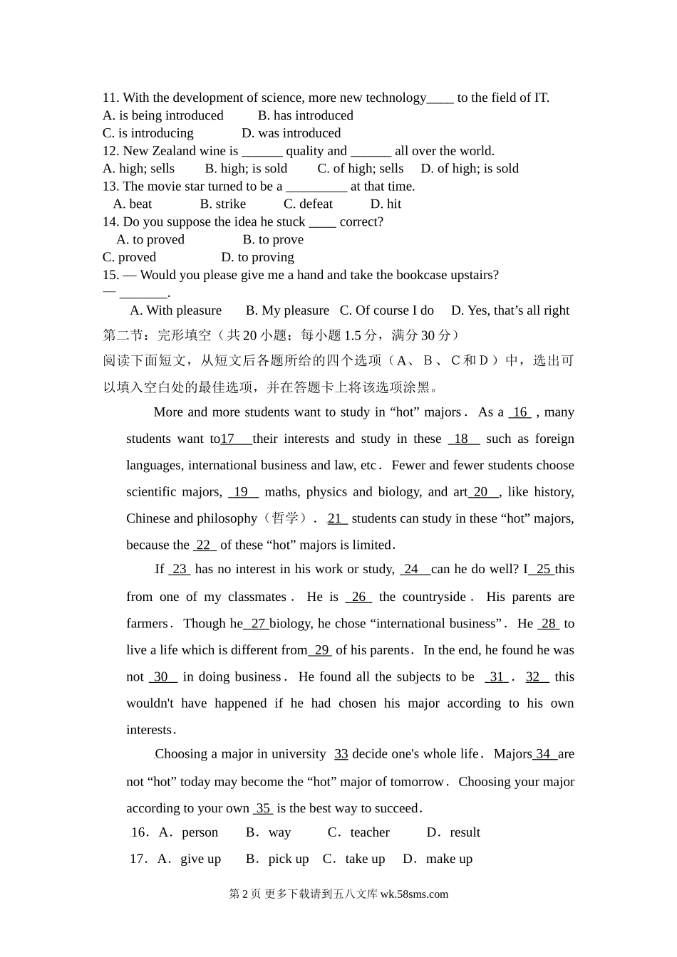高一英语考试试题命题人:斗鸡中学王生龙白云梅第Ⅰ卷第一部分:英语知识运用(共三节,满分85分)第一节单项填空(共15小题;每小题1分,满分15分)从A、B、C、D四个选项中,选出可以填入空白处的最佳选项,并在答题...