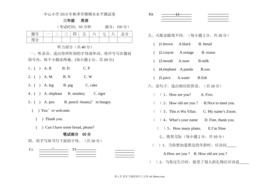 中心小学2018年秋季学期期末水平测试卷三年级英语(考试时间:60分钟满分:100分)题号一二三四五六七八总分得分听力部分(共40分)一、听录音,选出你所听到的字母或单词,将序号写在题前括号内,每个小题读两遍...
