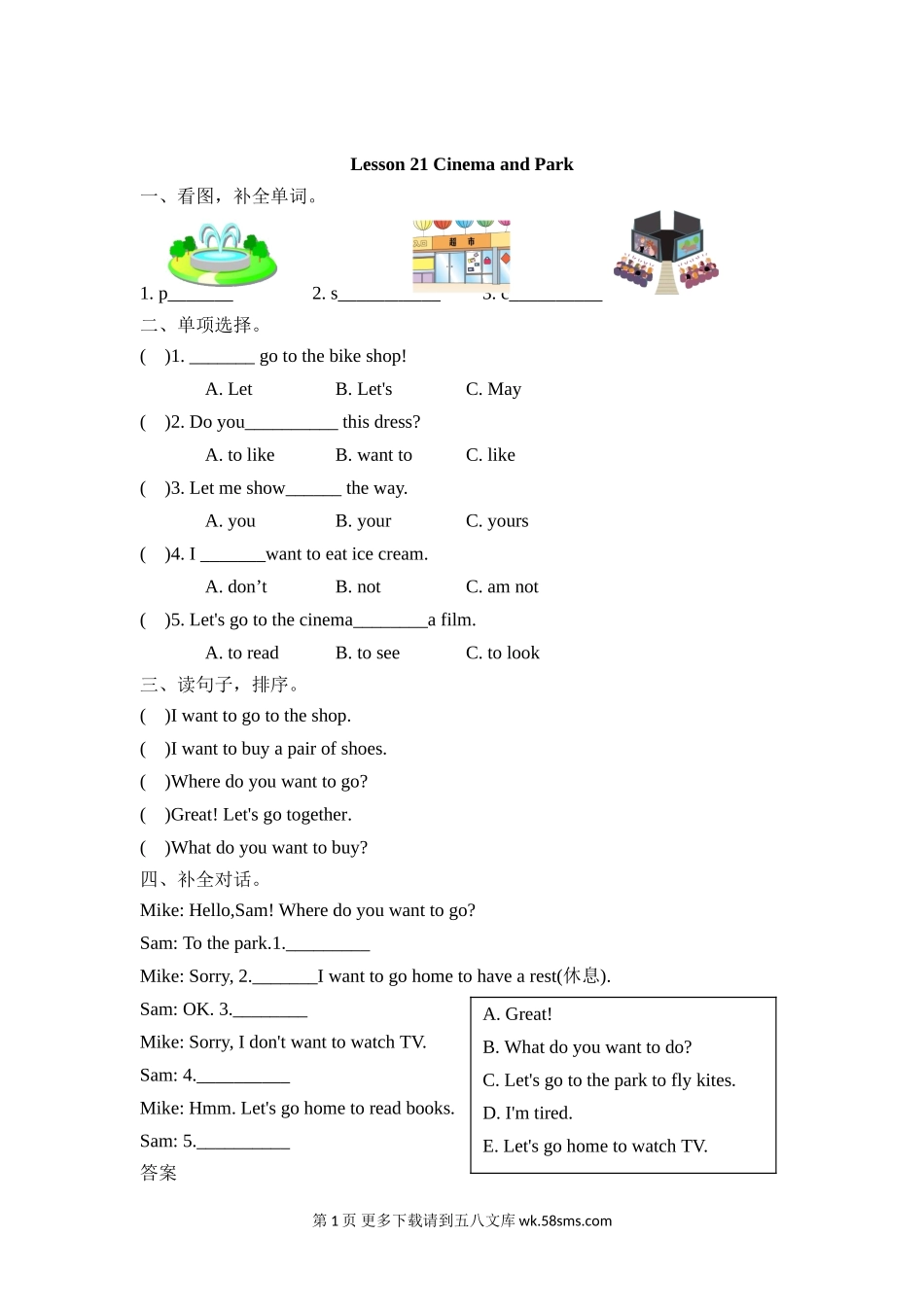Lesson21CinemaandPark一、看图,补全单词。1.p_______2.s___________3.c__________二、单项选择。()1._______gotothebikeshop!A.LetB.Let'sC.May()2.Doyou__________thisdress?A.tolikeB.wanttoC.like()3.Letmes...