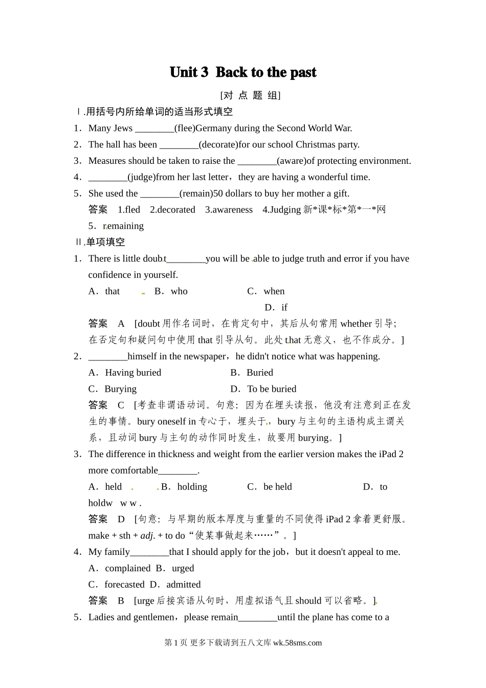 Unit3Backtothepast[对点题组]Ⅰ.用括号内所给单词的适当形式填空1.ManyJews________(flee)GermanyduringtheSecondWorldWar.2.Thehallhasbeen________(decorate)forourschoolChristmasparty.3.Measuresshouldb...