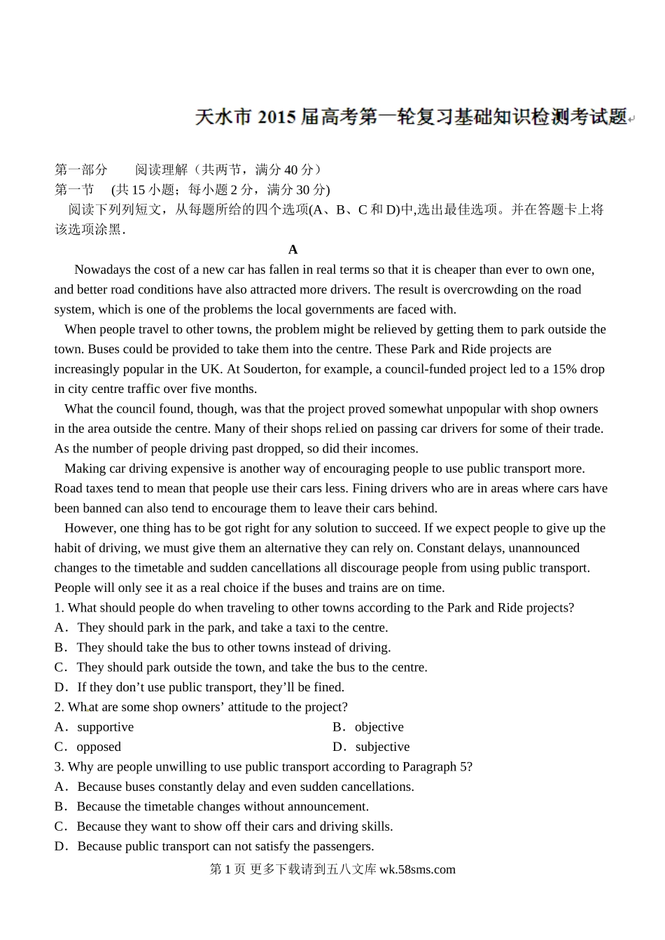 天水市2015届高三一轮复习英语考试题及答案.doc_第1页