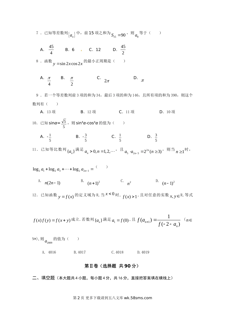 2011高一数学下学期期中试卷及答案.doc_第2页