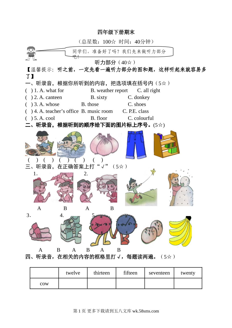 四年级下册期末(总星数:100☆时间:40分钟)听力部分(40☆)【温馨提示:听之前,一定先看一遍听力部分的图和题,这样听起来就容易多了】一、听录音,根据你所听到的内容,把选项填在括号内(5☆)()1.A.whatf...
