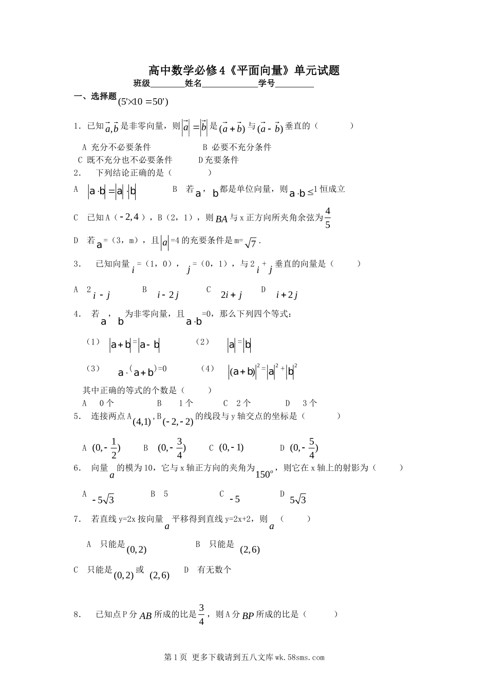 高中数学必修4《平面向量》单元试题班级姓名学号一、选择题)'5010'5(1.已知ba,是非零向量,则ba是)(ba与)(ba垂直的()A充分不必要条件B必要不充分条件C既不充分也不必要条件D充要条件2.下列结论正确...