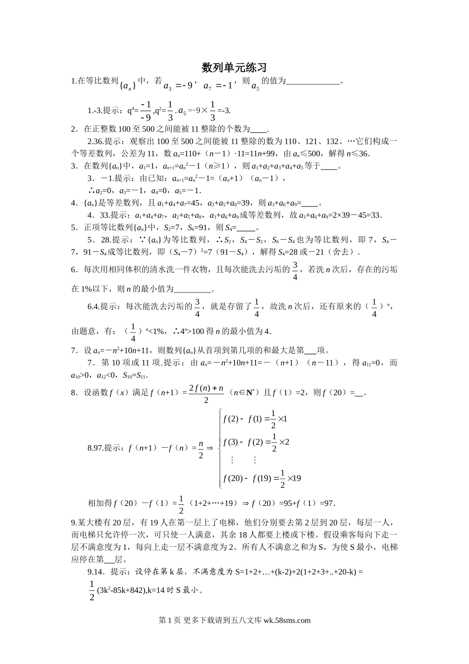 数列单元练习1.在等比数列}{na中,若93a,17a,则5a的值为_____________。1.-3.提示:q4=19,q2=13.5a=-9×13=-3.2.在正整数100至500之间能被11整除的个数为.2.36.提示:观察出100至500之间能被11整...