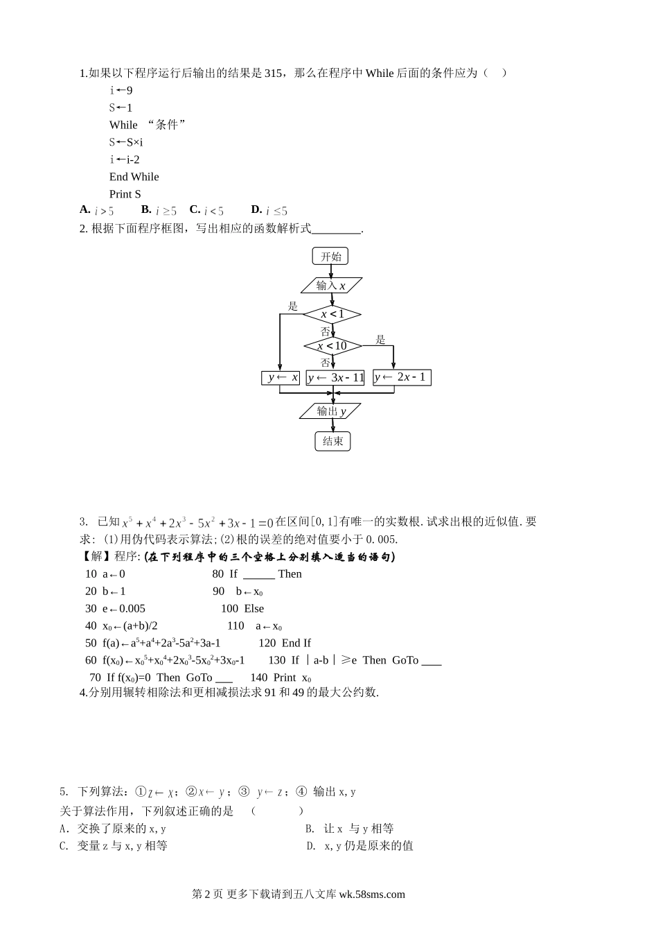 第5章复习课3分层训练第1页更多下载请到五八文库wk.58sms.com1.如果以下程序运行后输出的结果是315,那么在程序中While后面的条件应为()i←9S←1While“条件”S←S×ii←i-2EndWhilePrintSA.B.C.D.2.根据下面程...