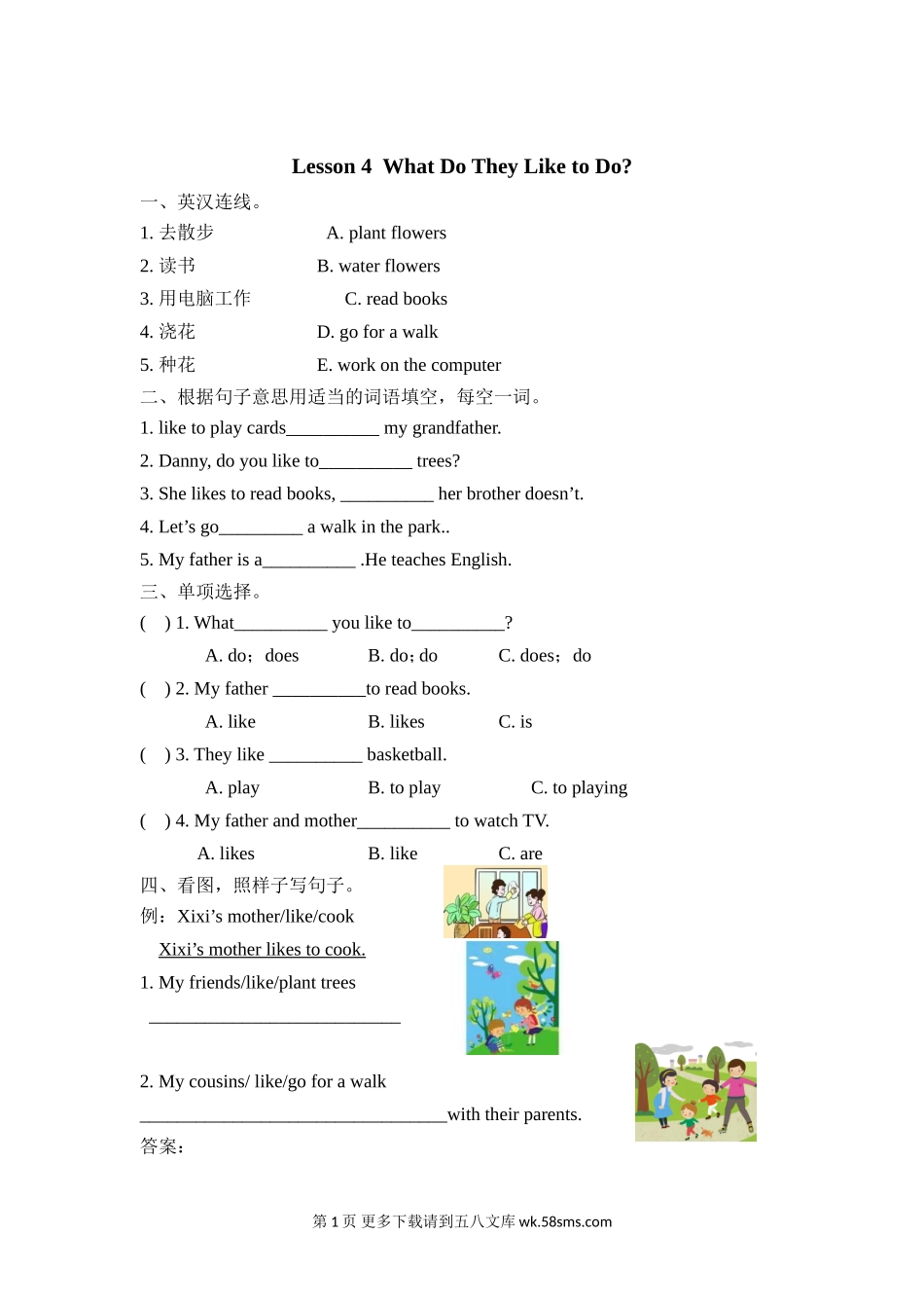 Lesson4WhatDoTheyLiketoDo?一、英汉连线。1.去散步A.plantflowers2.读书B.waterflowers3.用电脑工作C.readbooks4.浇花D.goforawalk5.种花E.workonthecomputer二、根据句子意思用适当的词语填空,每空一词。1.lik...