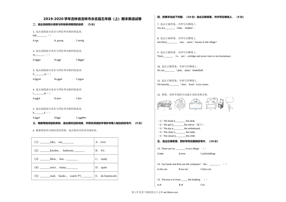 2019-2020学年吉林省吉林市永吉县五年级(上)期末英语试卷二、选出划线部分读音与所给单词相同的选项.(5分)1.选出划线部分读音与所给单词相同的选项.bab________()A.eyeB.youngC.windy2.选出划线部分读音...