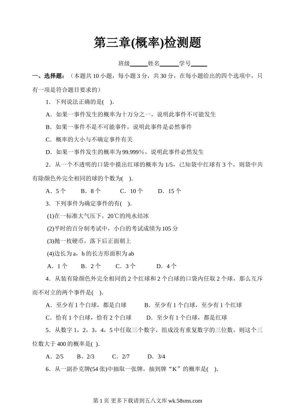 第三章(概率)检测题班级姓名学号一、选择题:(本题共10小题,每小题3分,共30分,在每小题给出的四个选项中,只有一项是符合题目要求的)1.下列说法正确的是().A.如果一事件发生的概率为十万分之一,说明此事...
