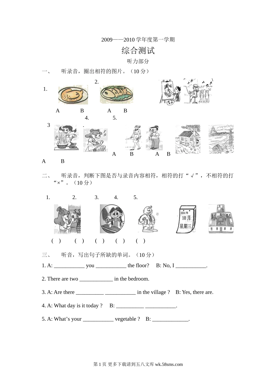 2009——2010学年度第一学期综合测试听力部分一、听录音,圈出相符的图片。(10分)2.1.ABAB4.5.3.ABABAB二、听录音,判断下图是否与录音内容相符,相符的打“√”,不相符的打“×”。(10分)1.2.3.4.5.()()()(...