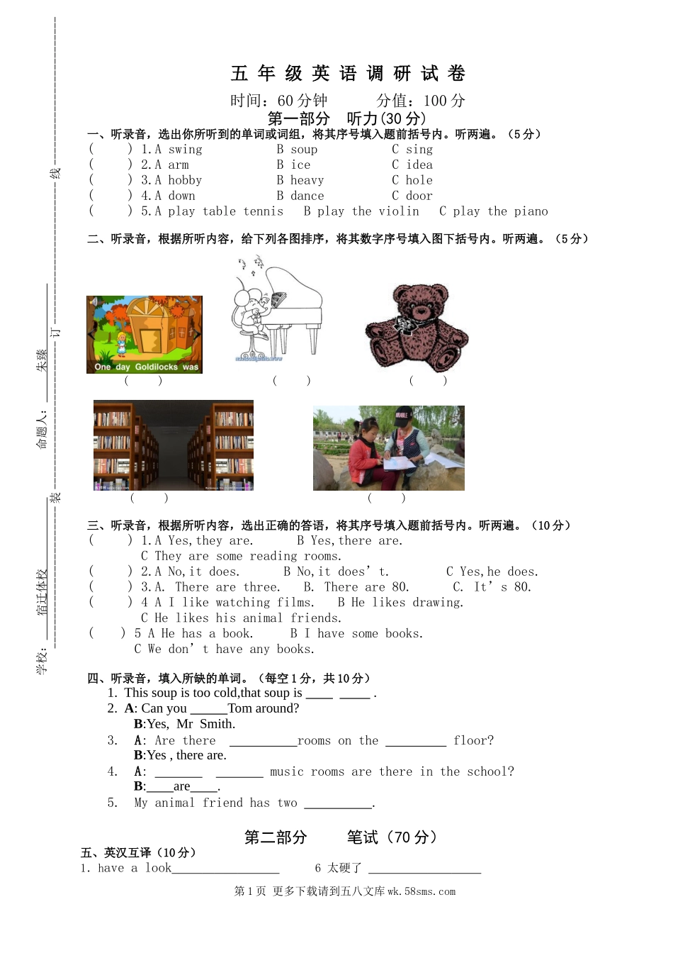 五年级英语调研试卷时间:60分钟分值:100分第一部分听力(30分)一、听录音,选出你所听到的单词或词组,将其序号填入题前括号内。听两遍。(5分)()1.AswingBsoupCsing()2.AarmBiceCidea()3.AhobbyBheavyChole()4...