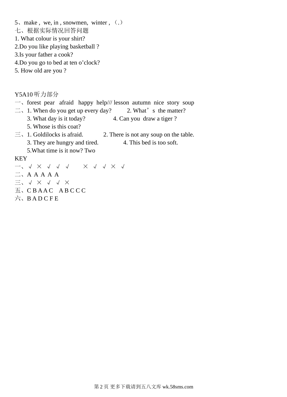 新译林版新译林版5AUnit15AUnit1测试卷测试卷Y5A10Name:一、所听单词与中文一致的打“√”,不一致的打“×”1、森林()2、狗熊()3、害怕的()4、开心()5、救命()6、学科()7、秋天()8、漂亮的()9、...