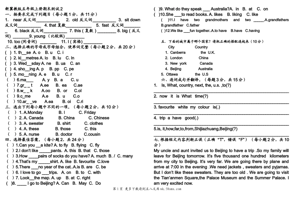 新冀教版五年级上册期末测试2一、按要求完成下列题目(每小题1分,共11分)1.near反义词__________2.old反义词__________3.sitdown反义词__________4.that复数___________5.fast反义词________6.black反义词____...