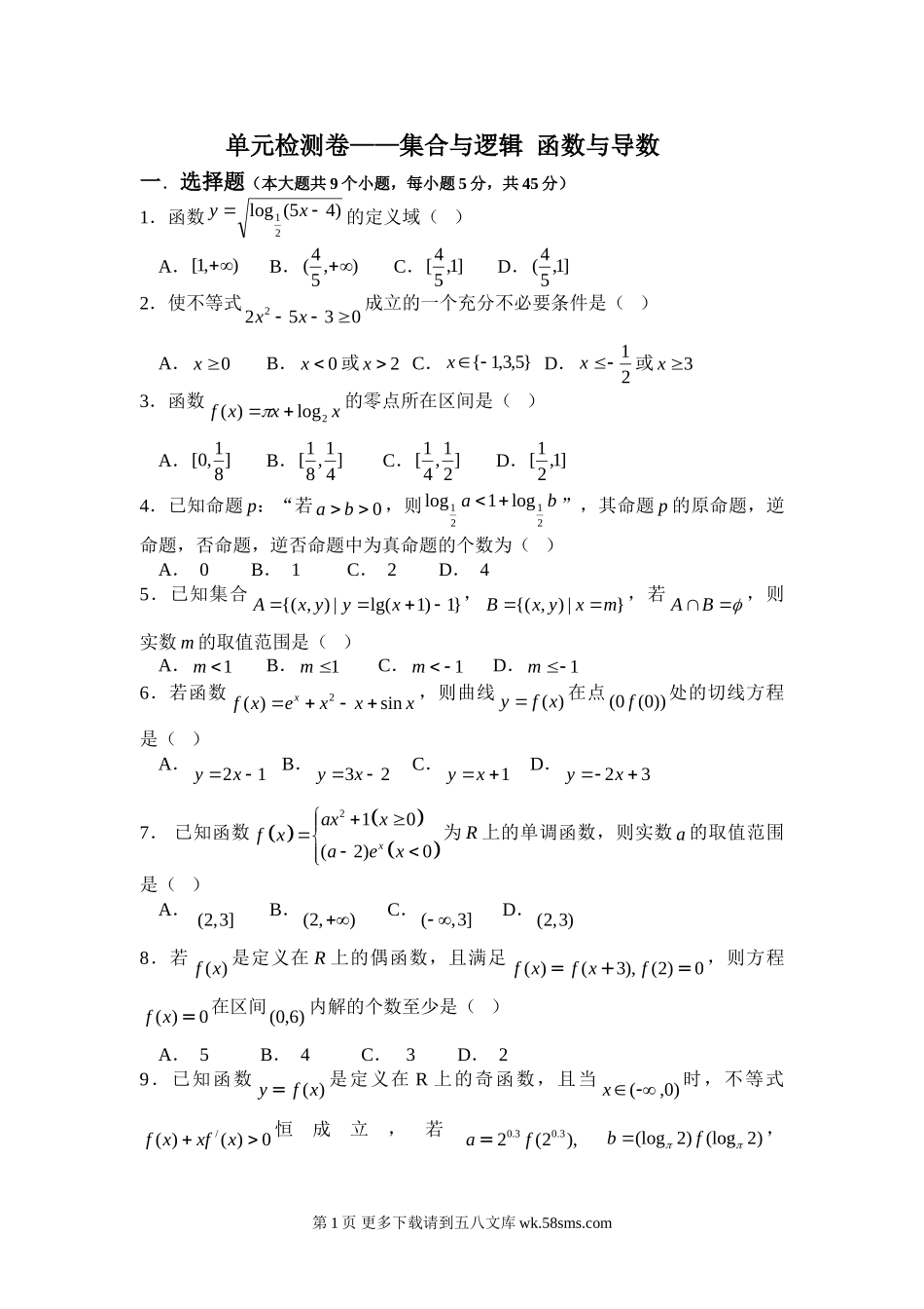 单元检测卷——集合与逻辑函数与导数一.选择题(本大题共9个小题,每小题5分,共45分)1.函数)45(log21xy的定义域()A.),1[B.),54(C.]1,54[D.]1,54(2.使不等式03522xx成立的一个充分不...