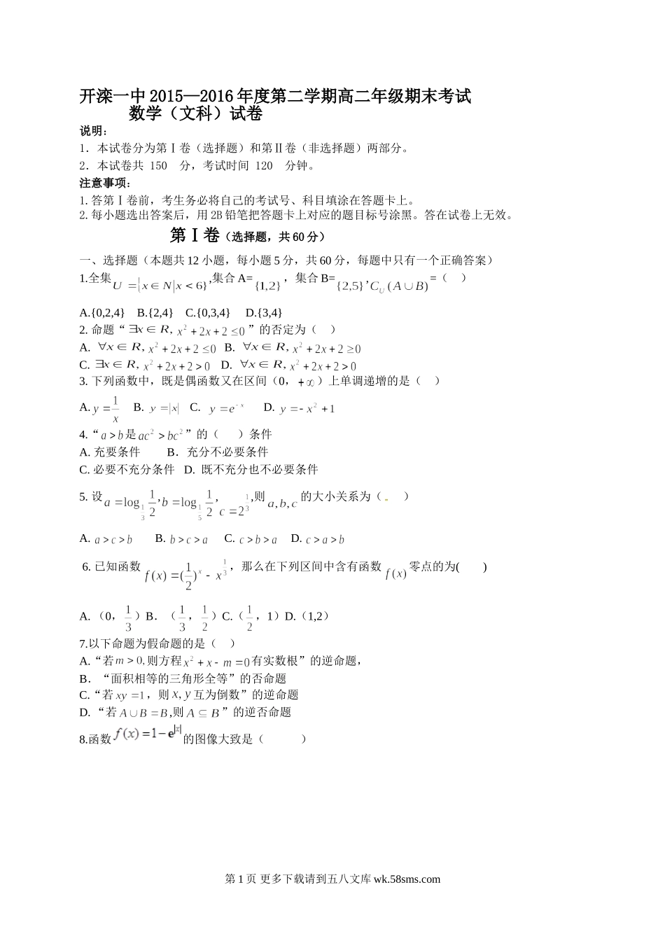 开滦一中2015-2016年度第二学期高二数学(文)期末试卷及答案.doc_第1页