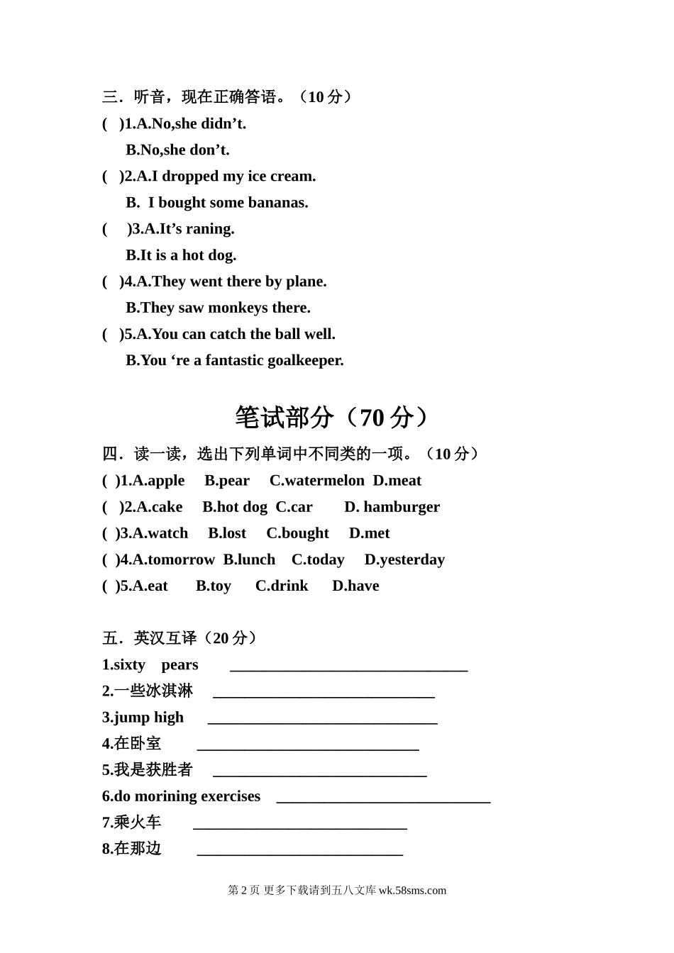 五年级上册模拟试卷听力部分(30分)一.听音,你所听到的单词。(10分)()1.A.likeB.loveC.list()2.A.fourB.fifteenC.fifty()3.A.thisB.thatC.those()4.A.tookB.takeC.taken()5.A.shortB.shortsC.Small()6.A.wel...