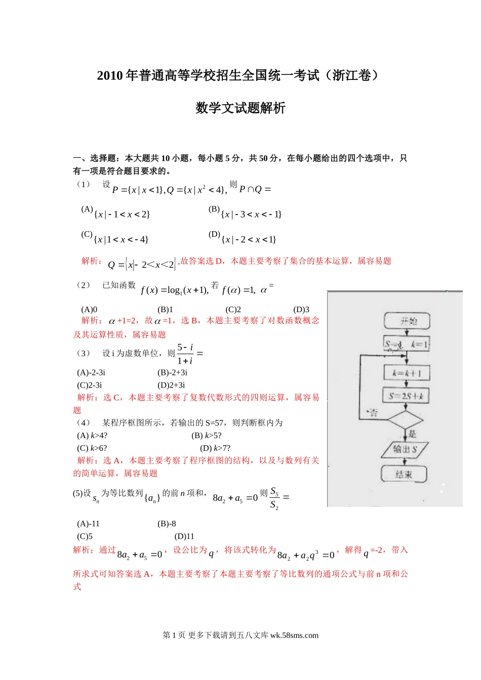 2010年普通高等学校招生全国统一考试(浙江卷)数学文试题解析一、选择题:本大题共10小题,每小题5分,共50分,在每小题给出的四个选项中,只有一项是符合题目要求的。(1)设2{|1},{|4},PxxQxx则PQ...