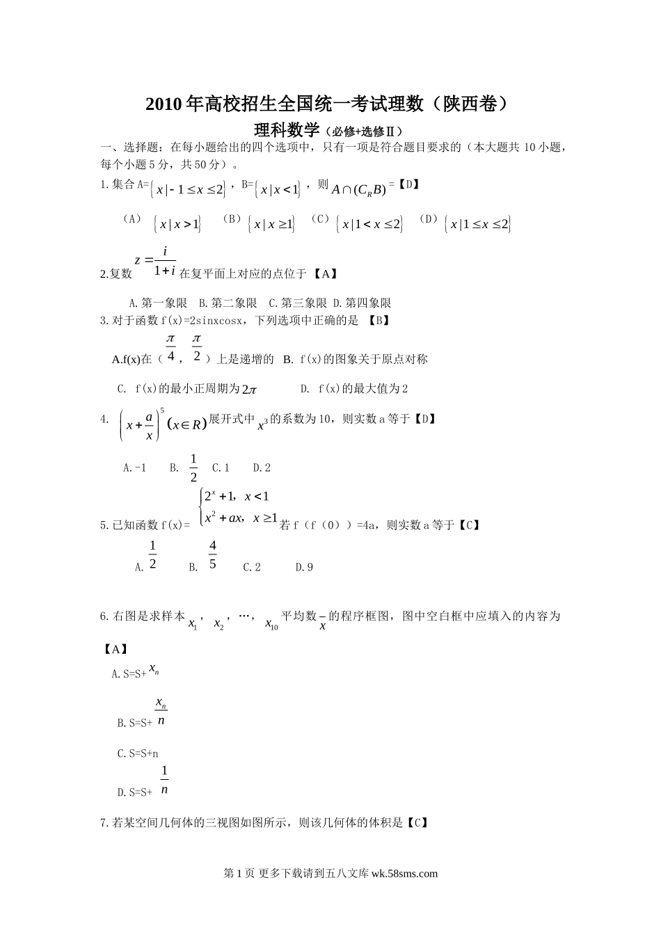 2010年高校招生全国统一考试理数(陕西卷)理科数学(必修+选修Ⅱ)一、选择题:在每小题给出的四个选项中,只有一项是符合题目要求的(本大题共10小题,每个小题5分,共50分)。1.集合A=|12xx,B=...