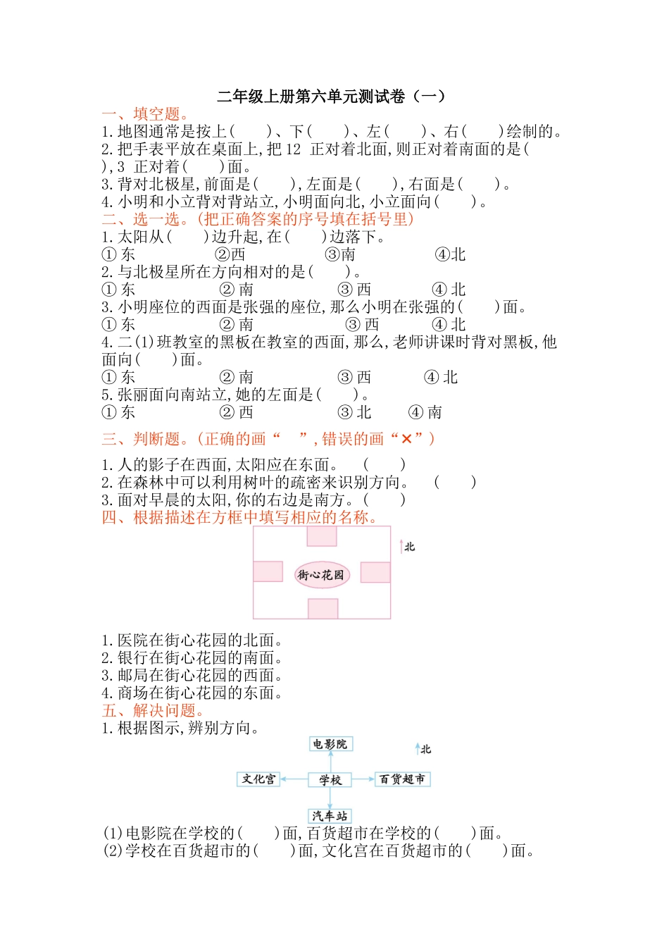 二年级上册第六单元测试卷(一)一、填空题。1.地图通常是按上()、下()、左()、右()绘制的。2.把手表平放在桌面上,把12正对着北面,则正对着南面的是(),3正对着()面。3.背对北极星,前面是(),左面是(),右面是()。4....
