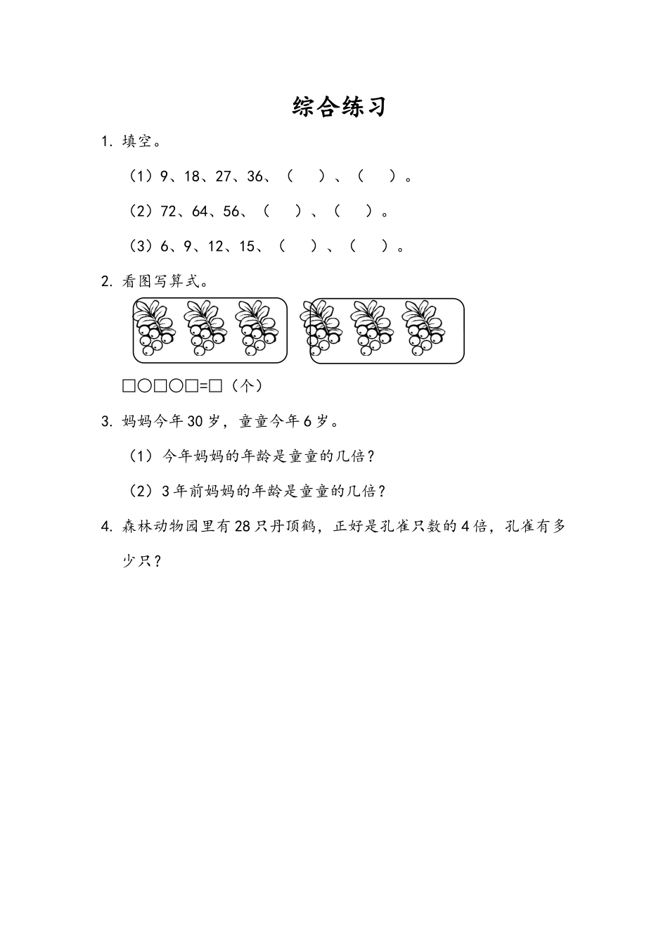 综合练习1.填空。(1)9、18、27、36、()、()。(2)72、64、56、()、()。(3)6、9、12、15、()、()。2.看图写算式。□○□○□=□(个)3.妈妈今年30岁,童童今年6岁。(1)今年妈妈的年龄是童童的...