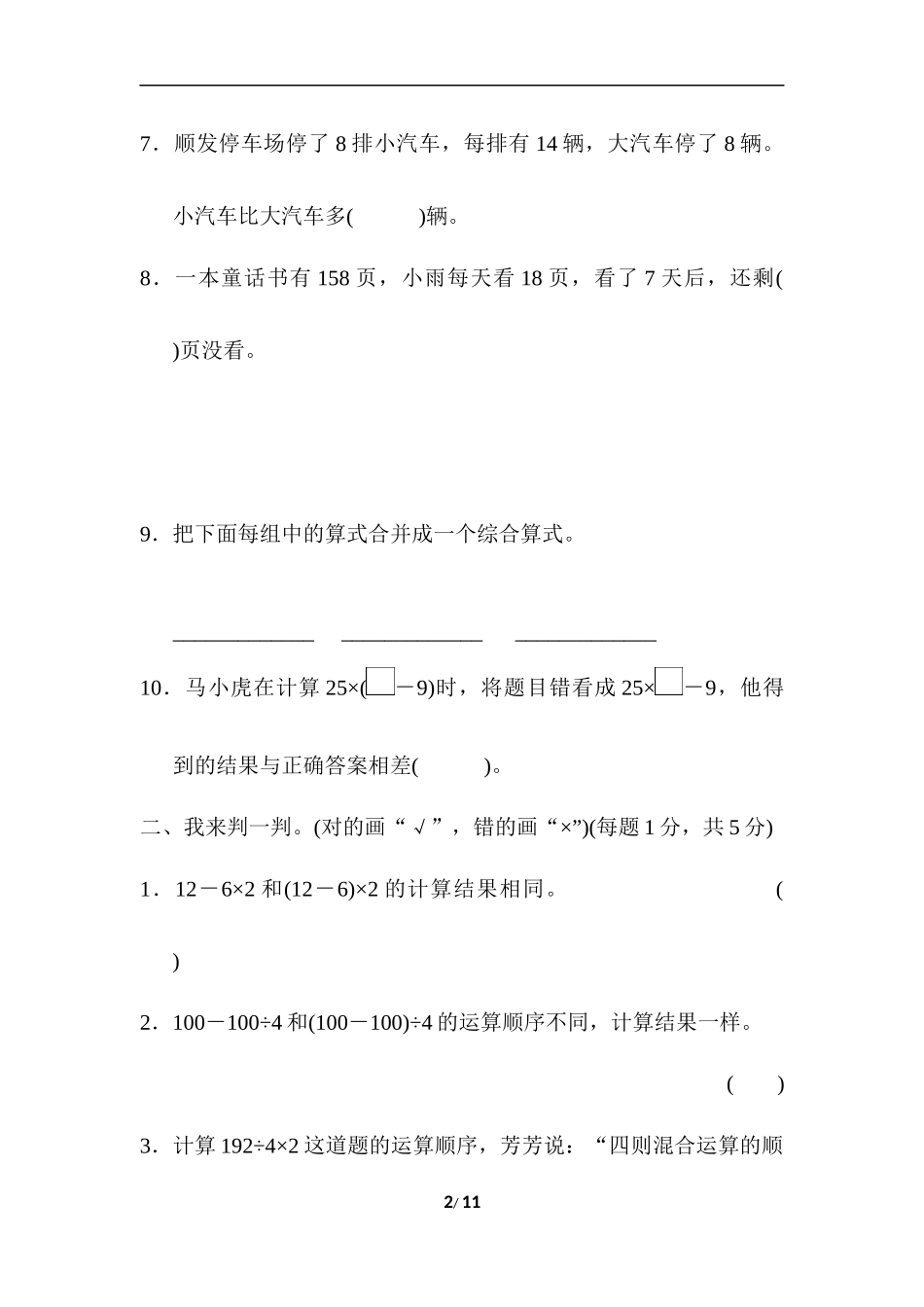 第六单元过关检测卷一、想一想,填一填。(3题6分,其余每空1分,共20分)1.计算(48-12)÷3时,应先算()法,再算()法。2.计算357-57÷3时,应先算()法,再算()法。3.先弄清运算顺序,再把相应算式的序号填在横...