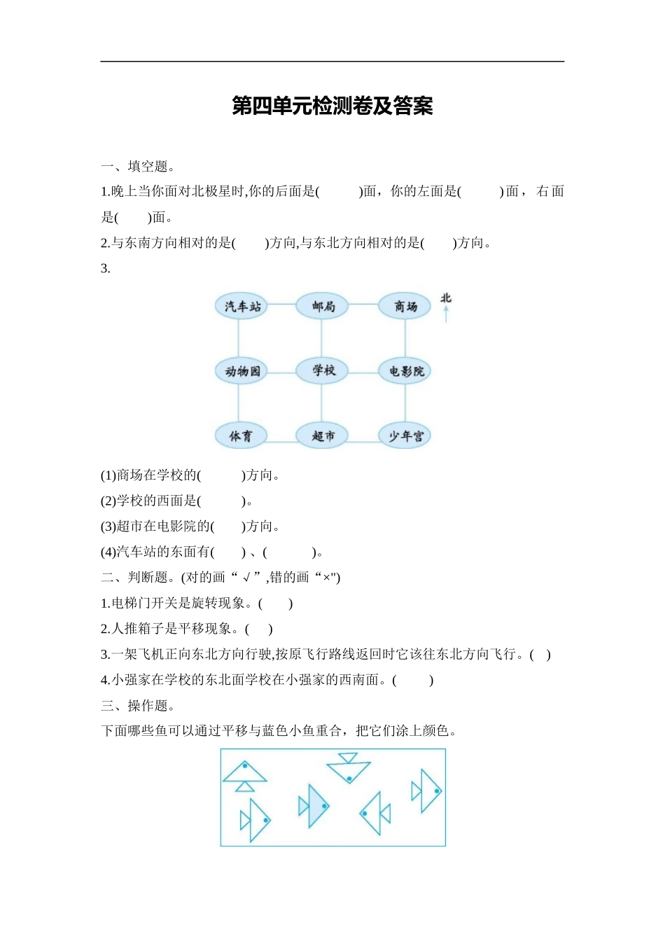 第四单元检测卷及答案一、填空题。1.晚上当你面对北极星时,你的后面是()面,你的左面是()面,右面是()面。2.与东南方向相对的是()方向,与东北方向相对的是()方向。3.(1)商场在学校的()方向。(2)学校的西面是()。(...