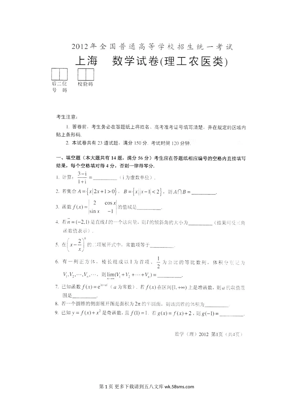2012年上海市高考数学试卷及答案(理数).doc_第1页