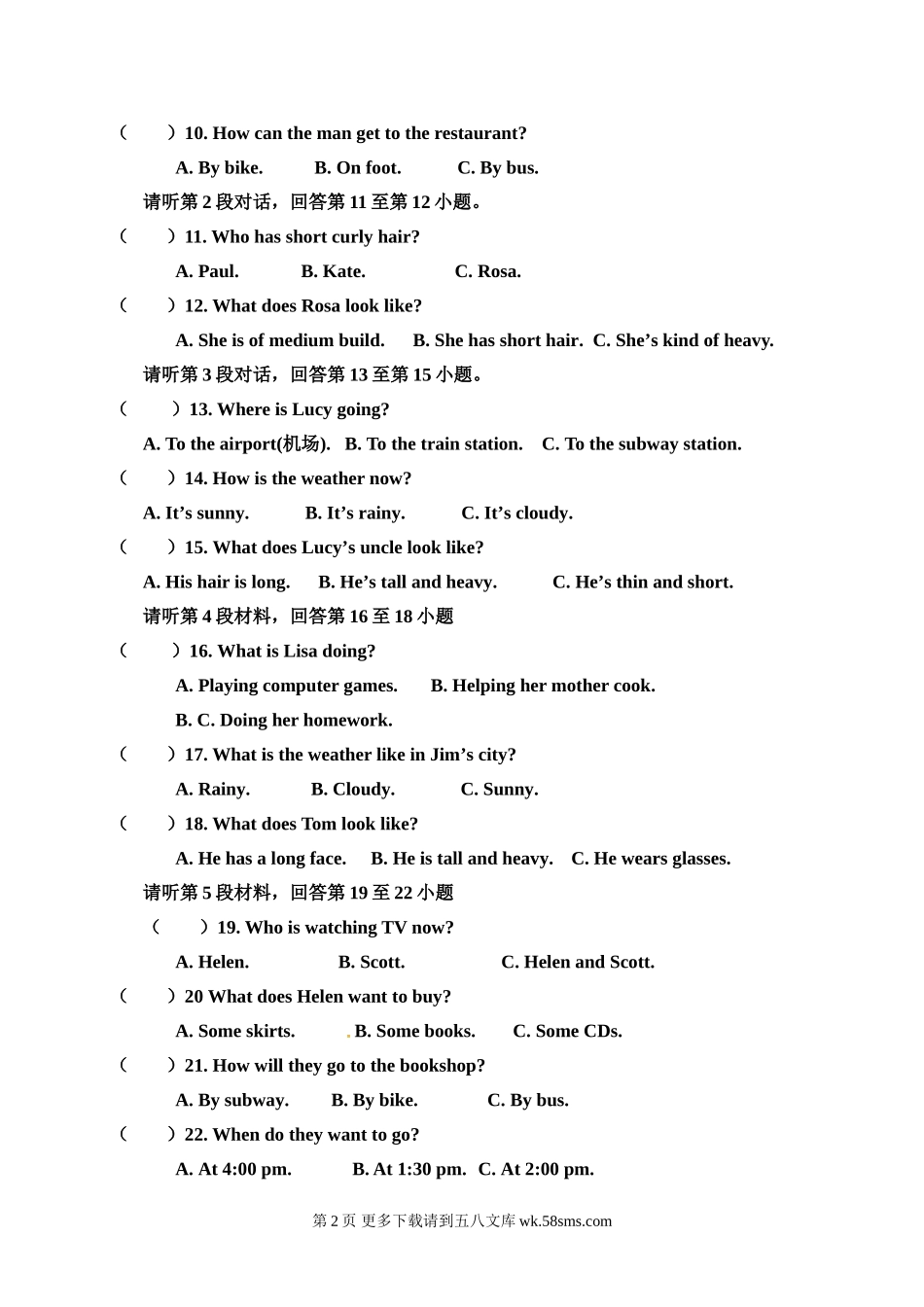 2016—2017学年七年级下学期第二次月考试卷一、听力测试(27分)A)请听下面8段对话。每段对话后有一小题,从题中所给的A、B、C三个选项中选出最佳选项,并将其填到答题卷的相应位置。听完每段对话后,你都将有十...