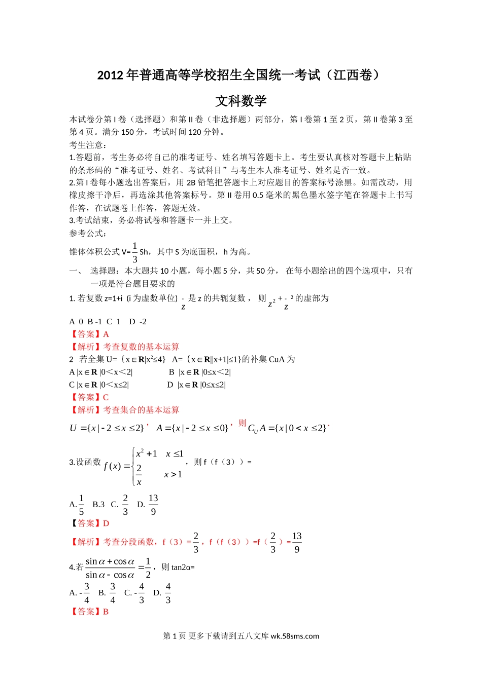 2012江西省高考文科数学试题答案解析.doc_第1页