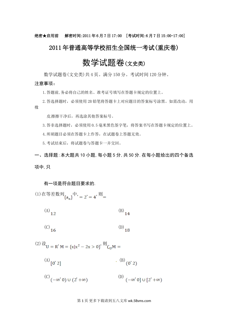 绝密★启用前解密时间:2011年6月7日17:00[考试时间:6月7日15:00-17:00]2011年普通高等学校招生全国统一考试(重庆卷)数学试题卷(文史类)数学试题卷(文史类)共4页。满分150分。考试时间120分钟。注意事项:1.答题前...