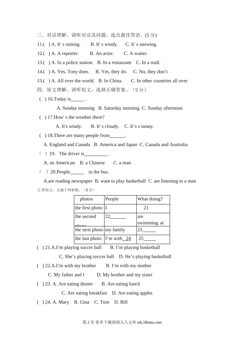 (满分120分,时间120分钟)Ⅰ.听力部分(共25分)一.听句选图。请听句子,选出相应的图画。(5分)二.请听句子,选答语(5分)6.()A.Atschool.B.IntheschoolC.Yes,Ican7.()A.No,I’mnotB.walkingC.May1st8...
