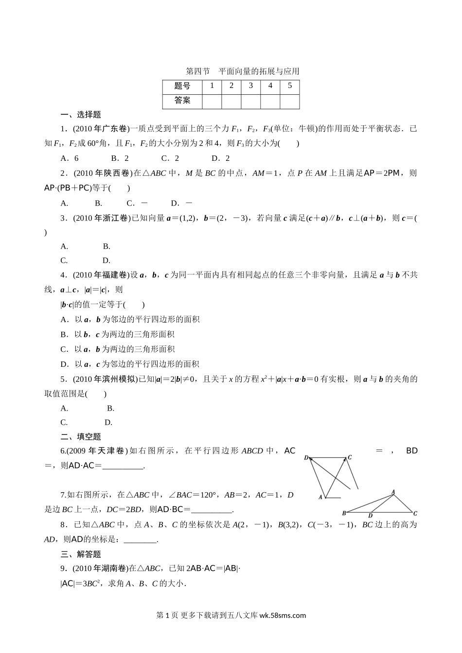 第四节平面向量的拓展与应用题号12345答案一、选择题1.(2010年广东卷)一质点受到平面上的三个力F1,F2,F3(单位:牛顿)的作用而处于平衡状态.已知F1,F2成60°角,且F1,F2的大小分别为2和4,则F3的大小为()A....