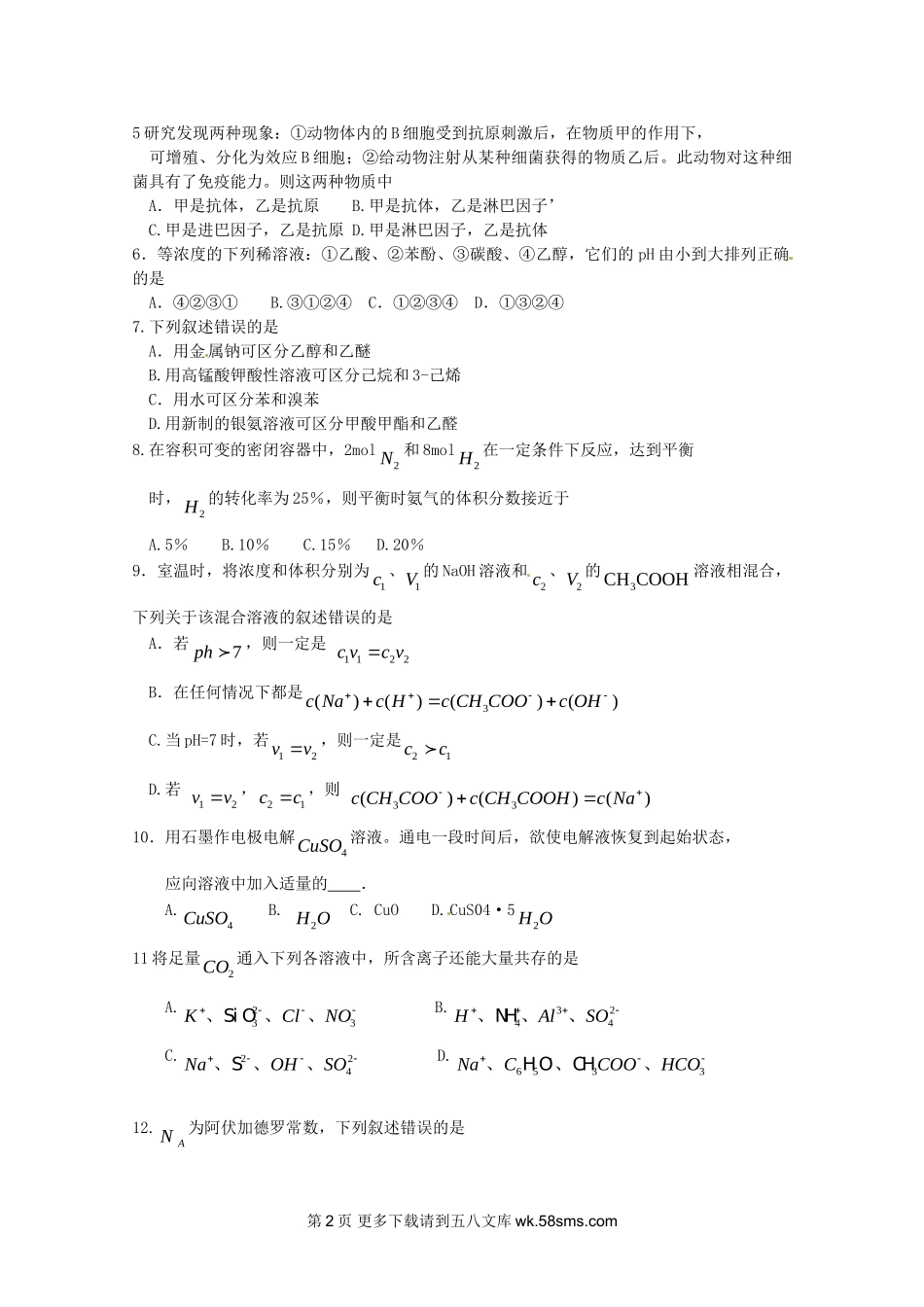 2011年普通高等学校招生全国统一考试理科综合能力测试本试卷分第1卷(选择题)和第2卷(非选择题)两部分,第1卷1至4页,第II卷5至12页,考试结束后,将本试题卷和答题卡一并交回。第I卷注意事项(1)答题前,考...