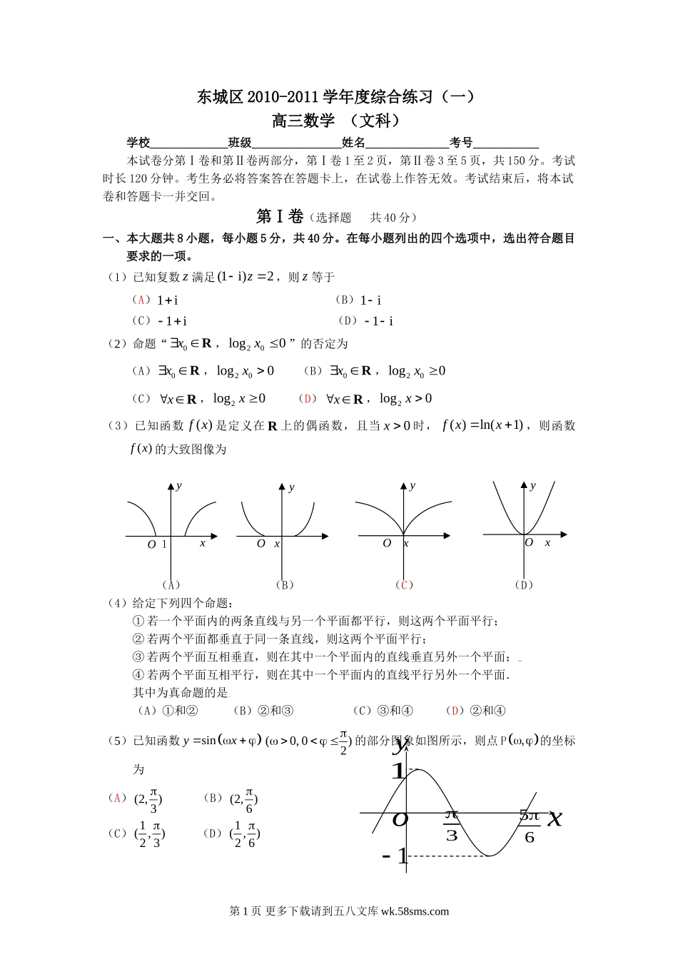 o356xy11东城区2010-2011学年度综合练习(一)高三数学(文科)学校_____________班级_______________姓名______________考号___________本试卷分第Ⅰ卷和第Ⅱ卷两部分,第Ⅰ卷1至2页,第Ⅱ卷3至5页,共150...