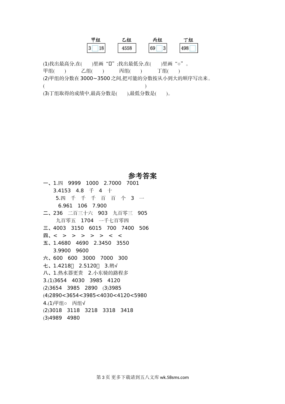 第四单元测试卷(一)一、填空题。1.一个数的最高位是千位,它是()位数。它最大是(),最小是()。2.一个一个地数,6999后面连续的两个数是()、()。3.3个一、5个十、1个百和4个千合起来是()。4.8040是由()个()和()个()...