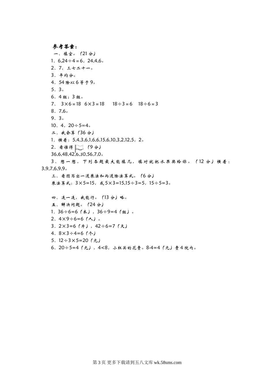 第七单元测试卷(二)姓名得分一、填空。(21分)1、一共24个苹果,平均分给4个小朋友,每个小朋友分()块。算式是()÷()=()(共1分),其中被除数是(),除数是(),商是()。2、21÷3=(),口决是()。3、每份分得同...