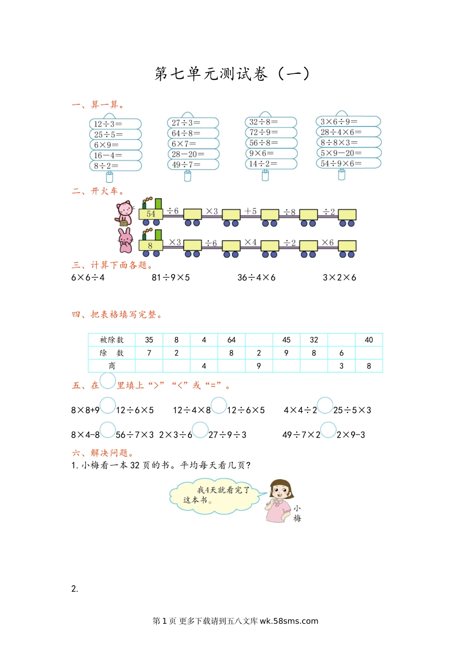 第七单元测试卷(一)一、算一算。二、开火车。三、计算下面各题。6×6÷481÷9×536÷4×63×2×6四、把表格填写完整。被除数358464453240除数7282986商4938五、在里填上“>”“<”或“=”。8×8+912÷6×512÷4...