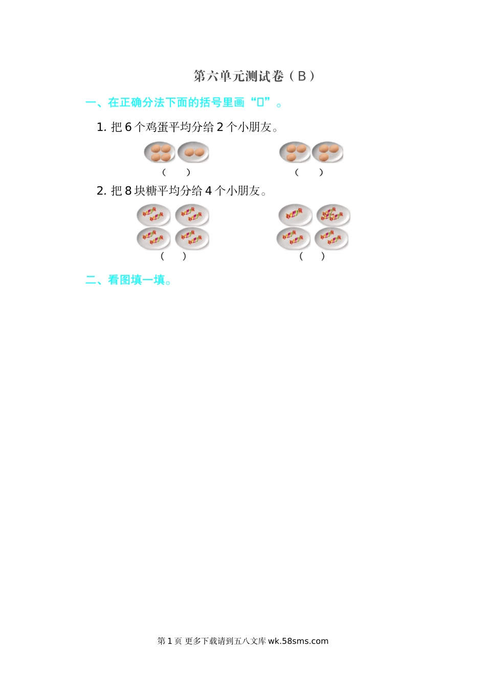 第六单元测试卷(B)一一、在正确分法下面的括号里画“􀳫”。1.把6个鸡蛋平均分给2个小朋友。2.把8块糖平均分给4个小朋友。二二、看图填一填。第1页更多下载请到五八文库wk.58sms.com三三、吹泡泡。四四、括号里...