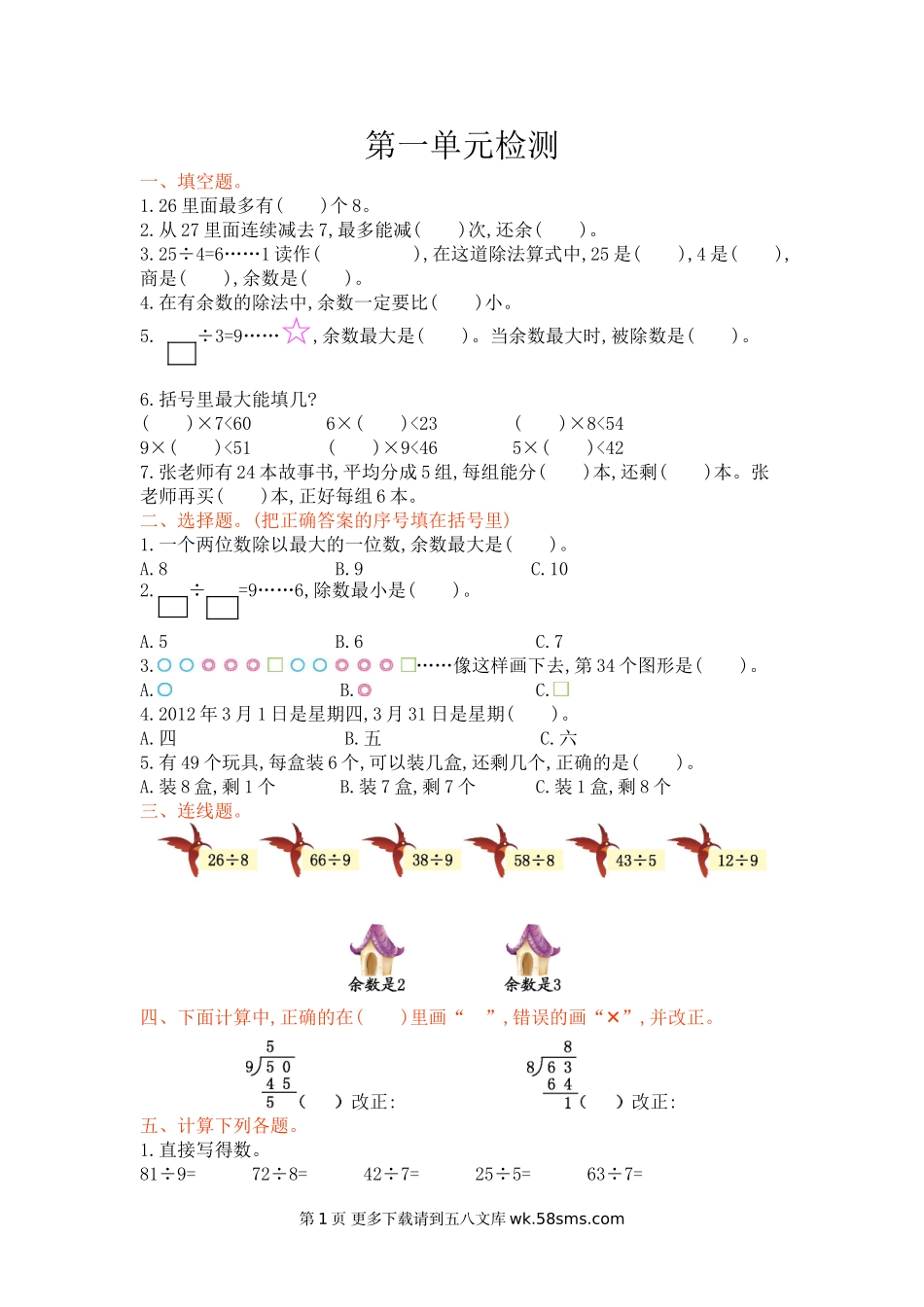 第一单元检测一、填空题。1.26里面最多有()个8。2.从27里面连续减去7,最多能减()次,还余()。3.25÷4=6……1读作(),在这道除法算式中,25是(),4是(),商是(),余数是()。4.在有余数的除法中,余数一定要比()小。5.÷3=...