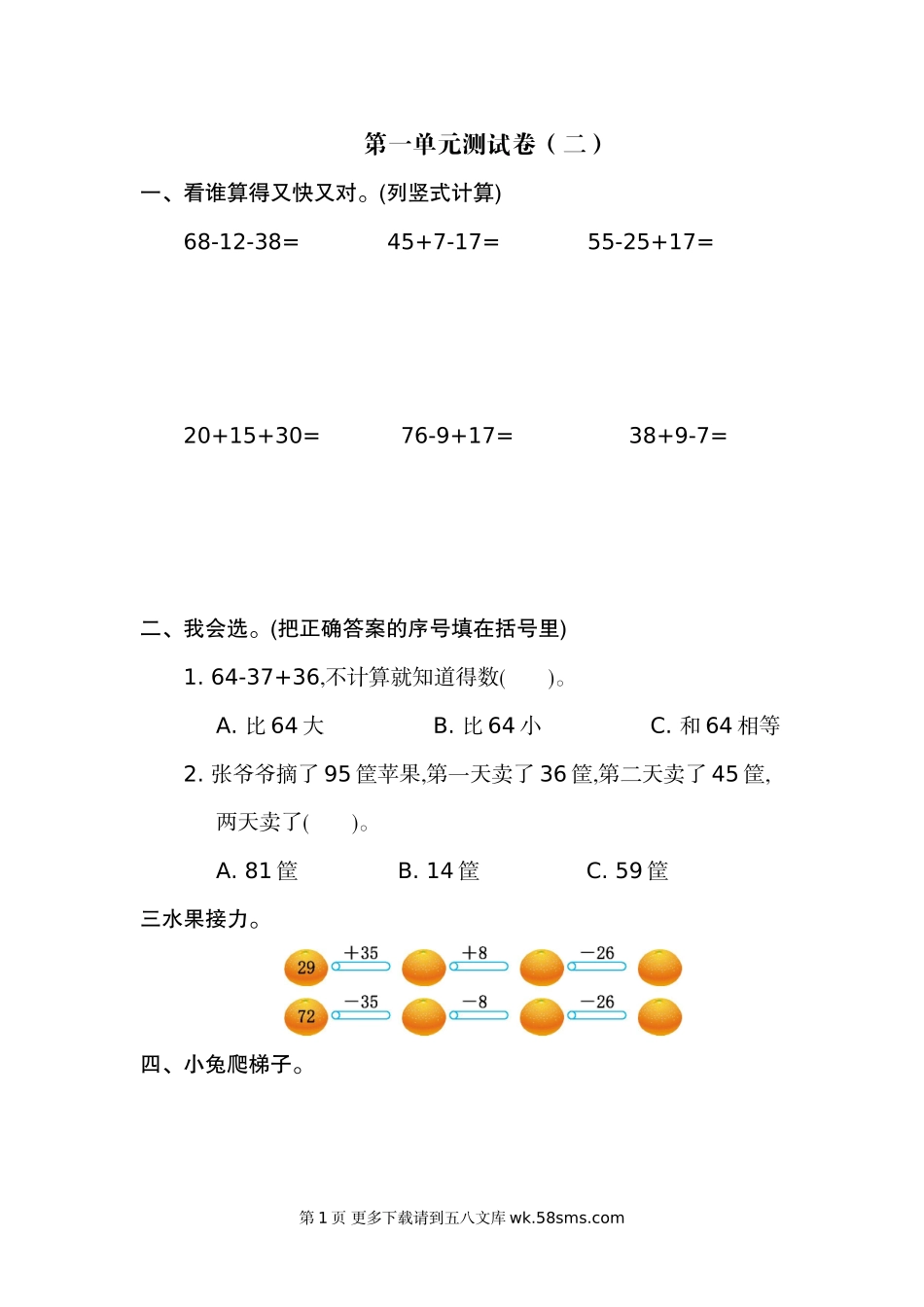 第一单元测试卷(二)一、看谁算得又快又对。(列竖式计算)68-12-38=45+7-17=55-25+17=20+15+30=76-9+17=38+9-7=二、我会选。(把正确答案的序号填在括号里)1.64-37+36,不计算就知道得数()。A.比64大B.比64小C.和64...