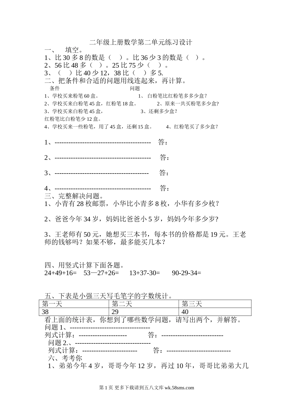 二年级上册数学第二单元练习设计一、填空。1、比30多8的数是()。比36少3的数是()。2、56比48多()。25比75少()。3、()比40少12,38比()多5.二、把条件和合适的问题用线连起来,再计算。条件问题1、学...