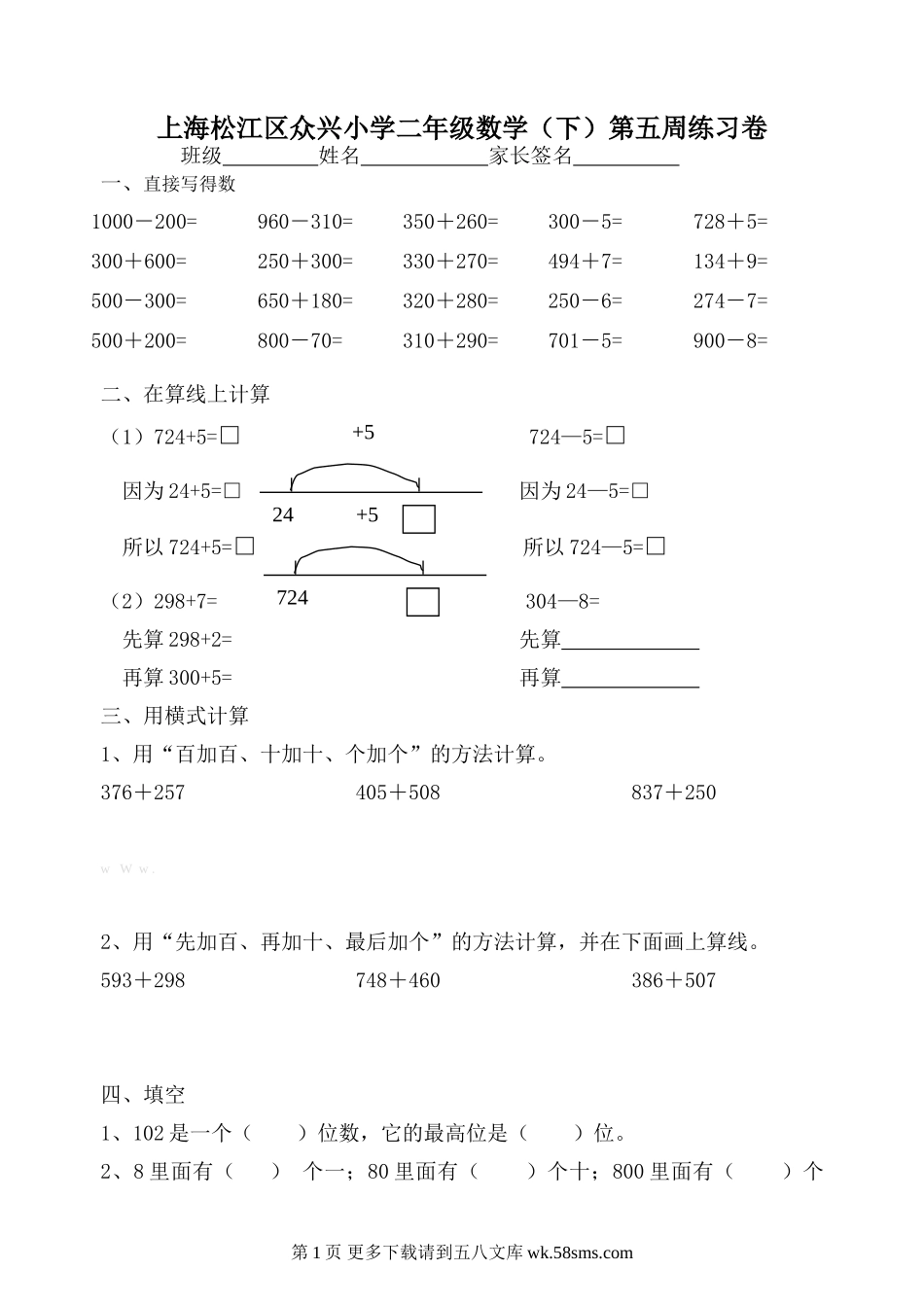 上海松江区众兴小学二年级数学(下)第五周练习卷班级姓名家长签名一、直接写得数1000-200=960-310=350+260=300-5=728+5=300+600=250+300=330+270=494+7=134+9=500-300=650+180=320+280=250-6=274...