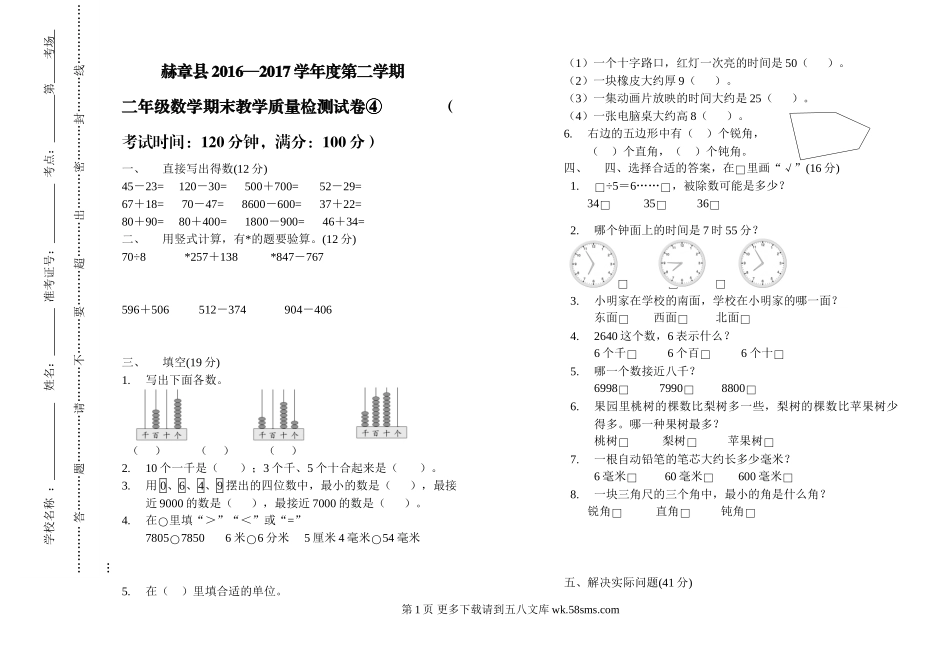 赫章县2016-2017学年度第二学期二年级数学期末检测试卷.doc_第2页