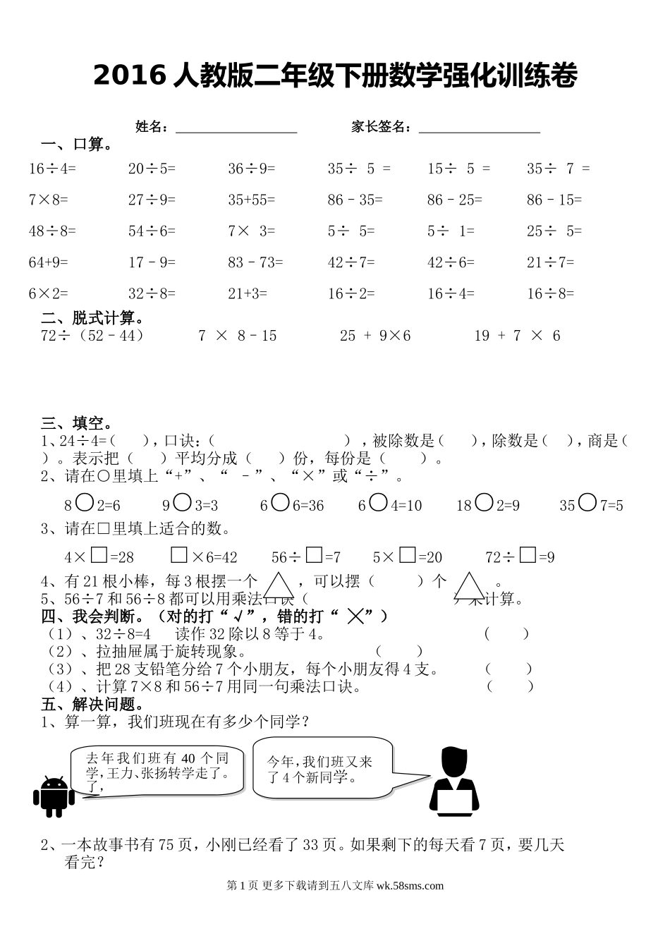 2016人教版二年级下册数学强化训练卷姓名:家长签名:一、口算。16÷4=20÷5=36÷9=35÷5=15÷5=35÷7=7×8=27÷9=35+55=86–35=86–25=86–15=48÷8=54÷6=7×3=5÷5=5÷1=25÷5=64+9=17–9=83–73=42÷7=42÷6=...