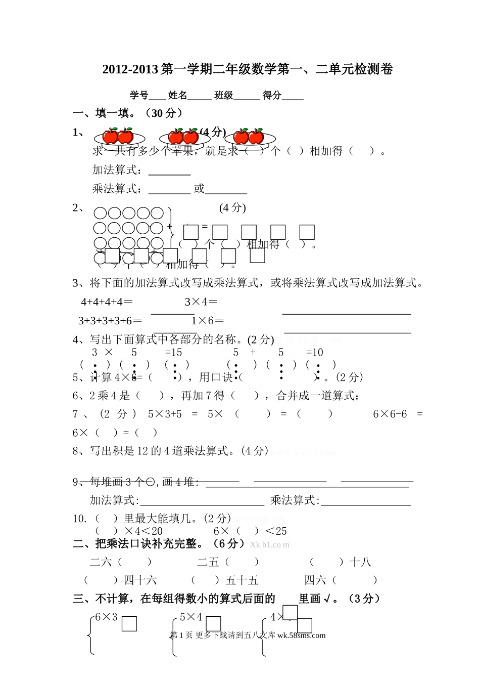 2012-2013第一学期二年级数学第一、二单元检测卷学号姓名班级得分一、填一填。(30分)1、(4分)求一共有多少个苹果,就是求()个()相加得()。加法算式:乘法算式:或2、(4分)+++=++++=()个()相加得()...