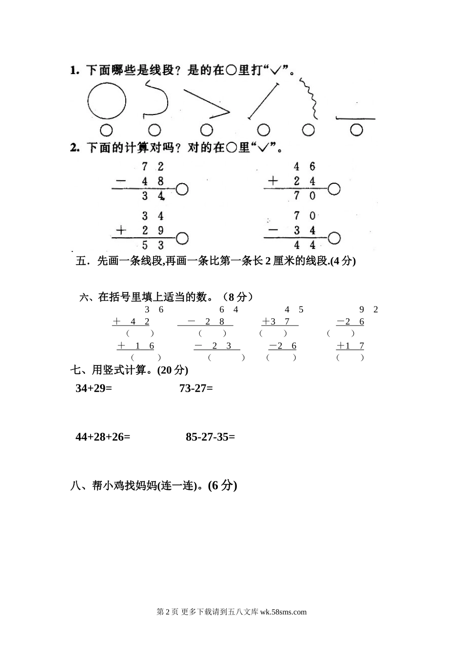 2009-2010学年度第一学期姓名学号成绩一、口算。(8分)79-20=64-7=71-9=26+4-21=92-7=60+30=33-8=53+30-70=58+6=75+10=30+27=42+9-20=84-40=90+9=8+65=69-55-9=二、填空。(14分)1.填“厘米”或“米”。(6分)课本...